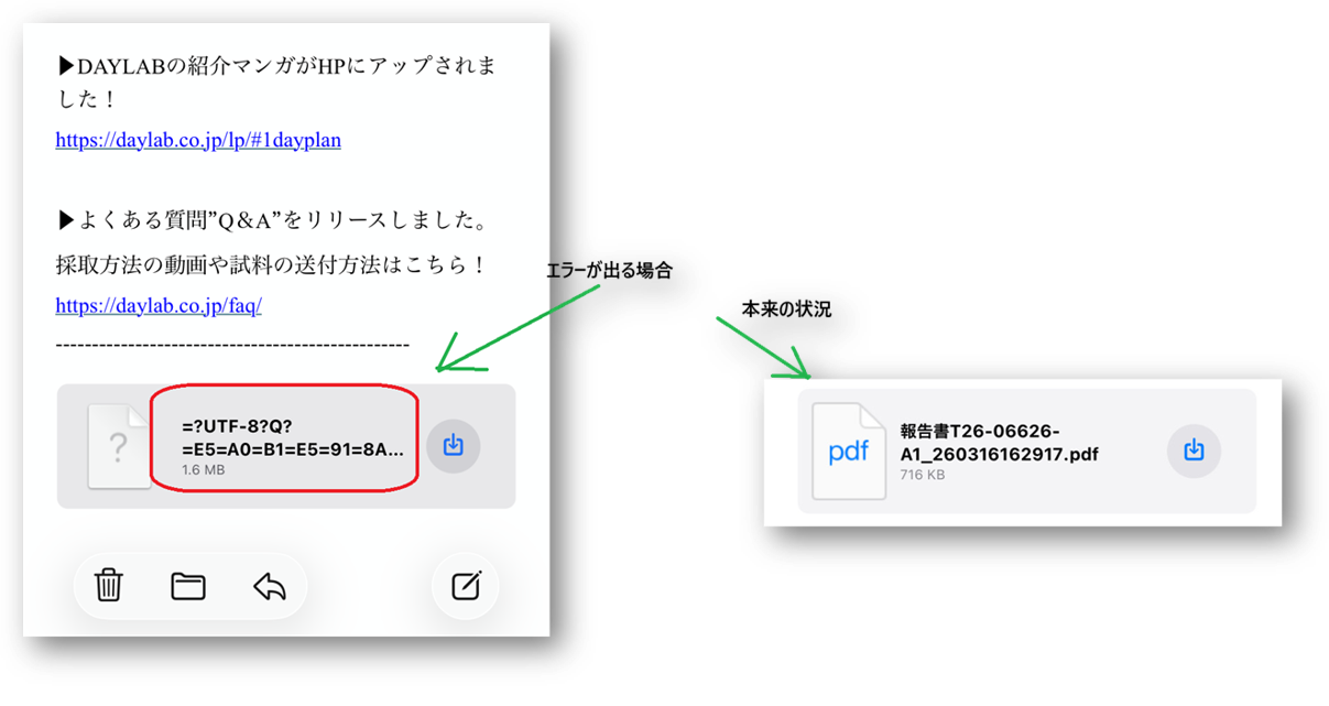 - iPhoneの標準メールアプリで報告書メールを受信した際、添付ファイルの名称が文字化けしている