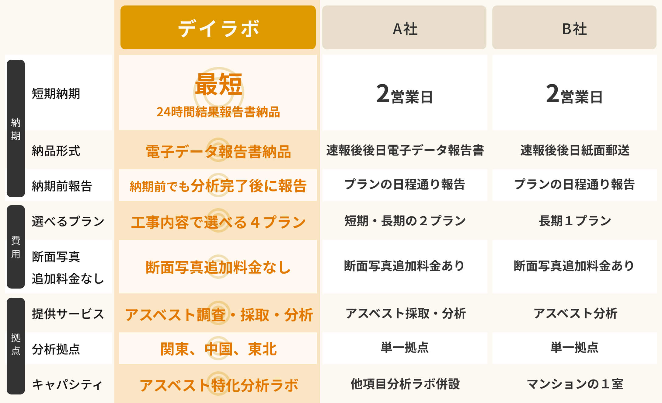 デイラボは分析だけでなく、アスベスト調査や検体採取にも対応可能。さらに、経験豊富なスタッフが、社内体制の構築や研修なども含めてトータルでサポートいたします。東京・広島・仙台に拠点を構え、全国対応。全拠点に無料駐車場を完備しており、検体を車で直接お持ち込みいただくことも可能です。