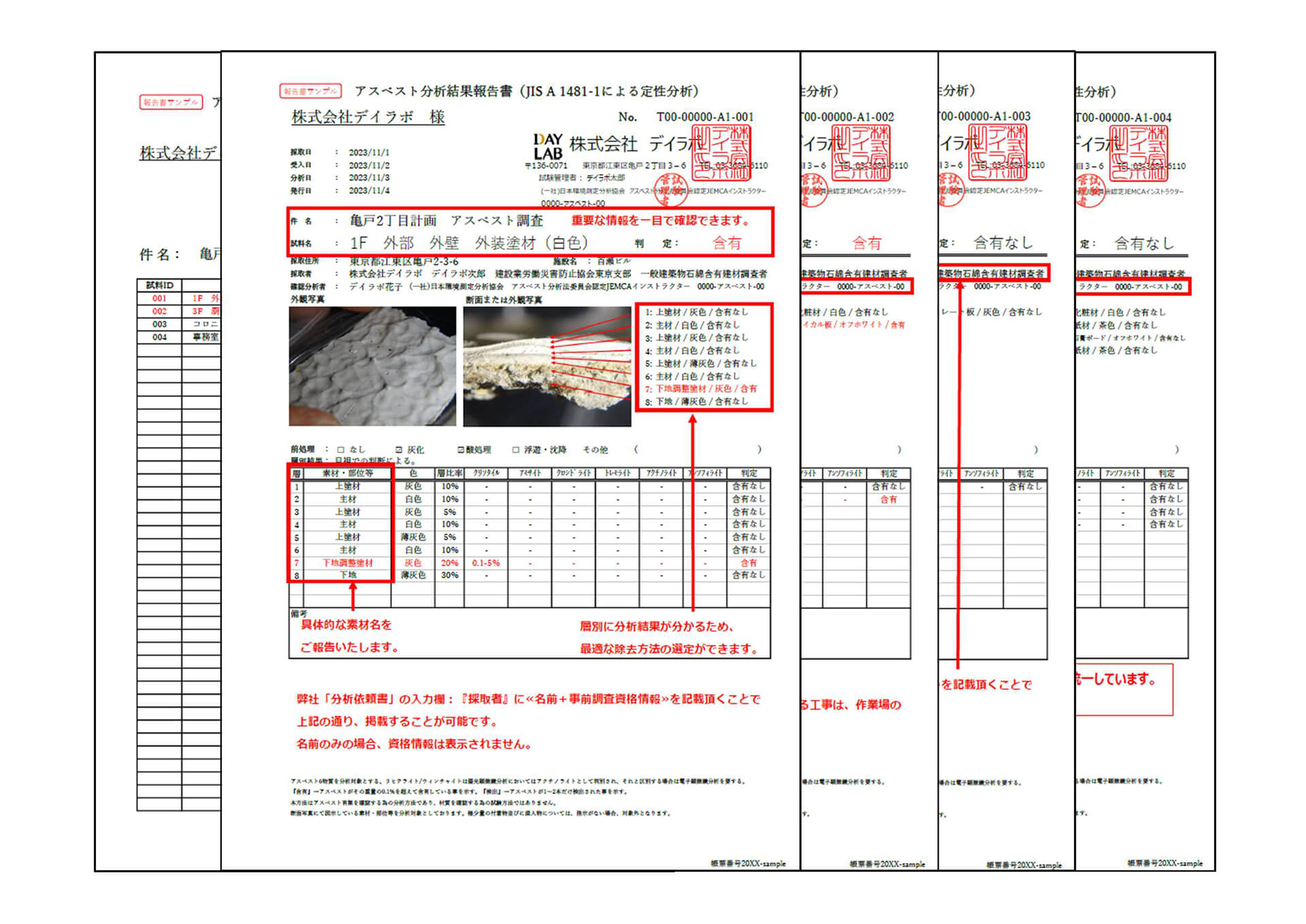 現地での目視調査、分析調査等に基づき作成した調査結果報告書をメールにて納品します。