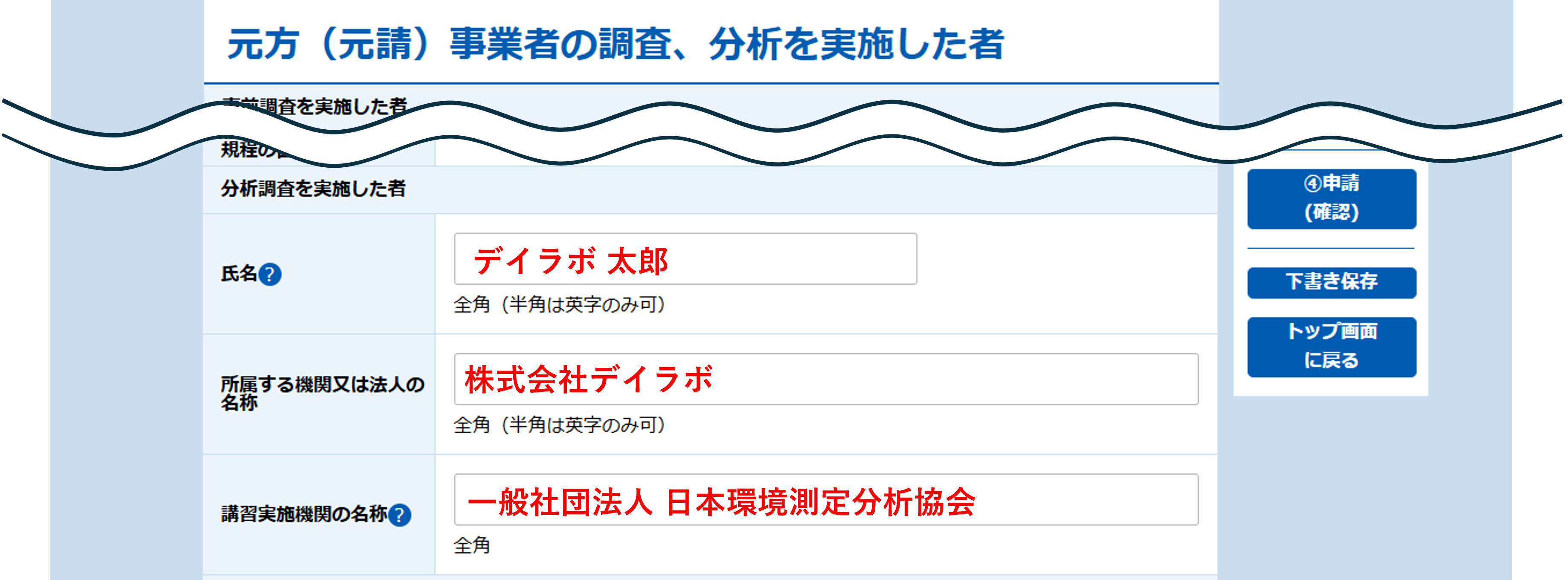 分析調査結果を入力する前のページ①における「元方(元請)事業者の調査、分析を実施した者」の項目欄の「分析調査を実施した者」に記載しましょう。