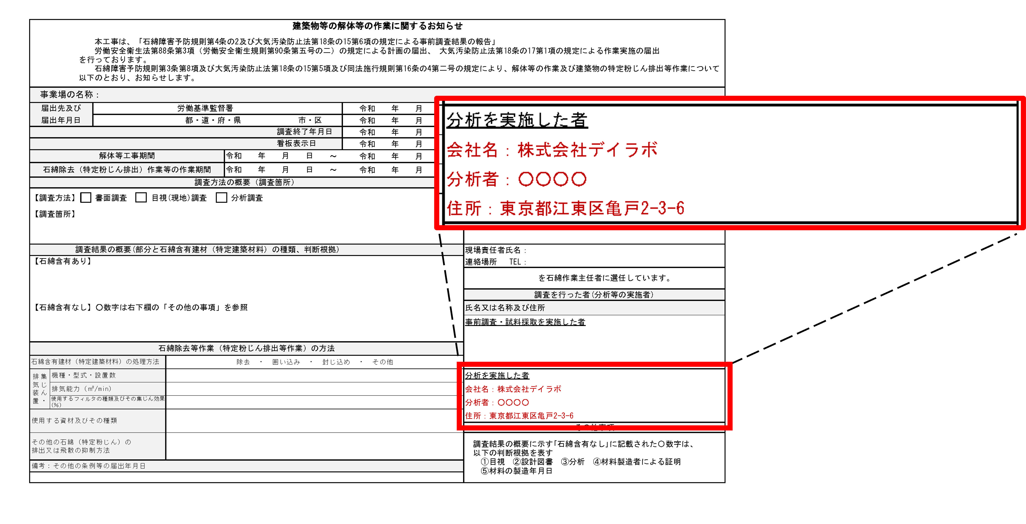 上記のような、工事の際に作業内容を掲示する工事看板等においての「分析を実施した者」の項目へも記載が必要です。こちらも忘れずに行いましょう。