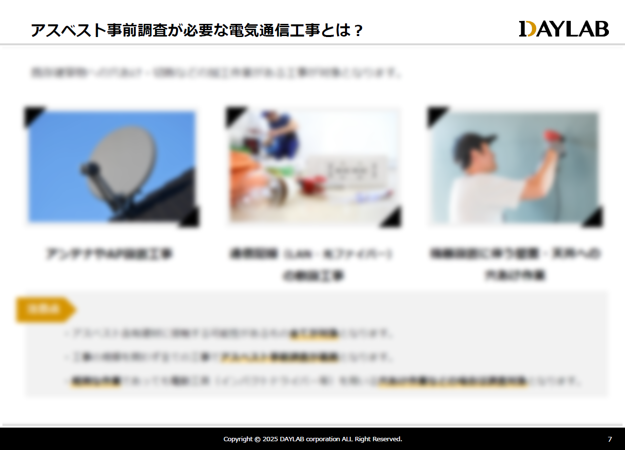 具体的に対象となる工事は何なのか、軽微な作業であっても対象となるのか等、アスベスト事前調査が必要な電気通信工事の内容も当資料で明確に記載しております。
