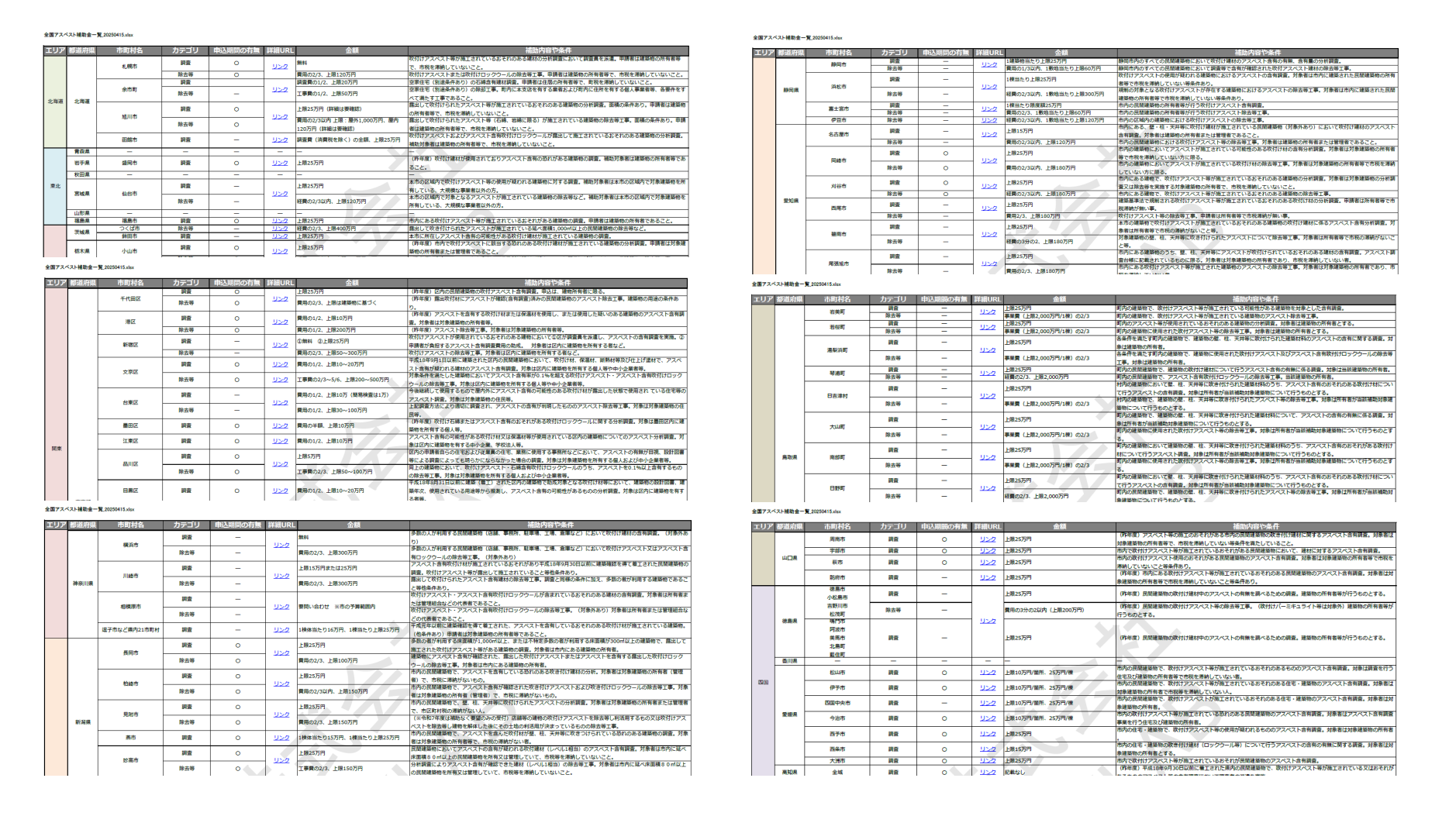 アスベスト調査・除去に関する補助金制度は、全国の都道府県・市区町村によって内容が異なります。Webサイトもバラバラで把握が難しいのが現状であり、実際弊社のお客様からもお問い合わせを多くいただいておりました。