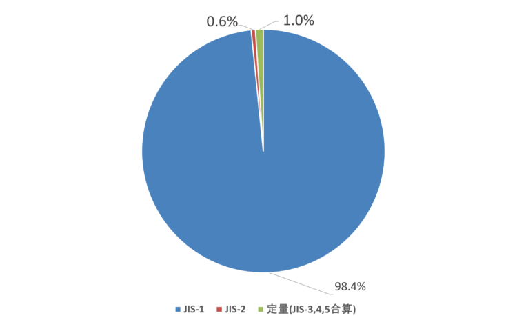 現状、実際に解体・補修工事にあたって事前調査における分析で用いられている手法の大半がJIS-1による定性分析です。法律で定められた義務をクリアするにあたっても実際の作業の安全に配慮する上でも定性分析を行い、石綿が検出された場合は必要な措置を講ずれば十分です。 定性分析のうち層ごとの分析が可能なJIS-1によって行うのが望ましいと言えるでしょう。実際、デイラボにご依頼いただく分析も全体の98.4%がJIS-1による分析であり、JIS-1分析に特化しております。