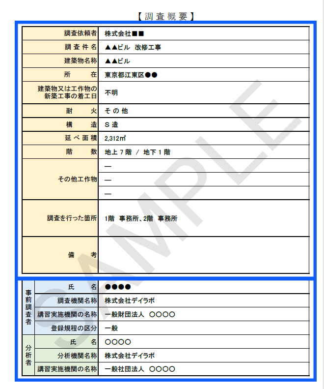 表紙後の1枚目には調査概要の記載がございます。 上部には事前調査の依頼者であるお客様の会社名や調査対象の建築物名等、下部には調査や分析をおこなったデイラボの担当者名をまとめています。