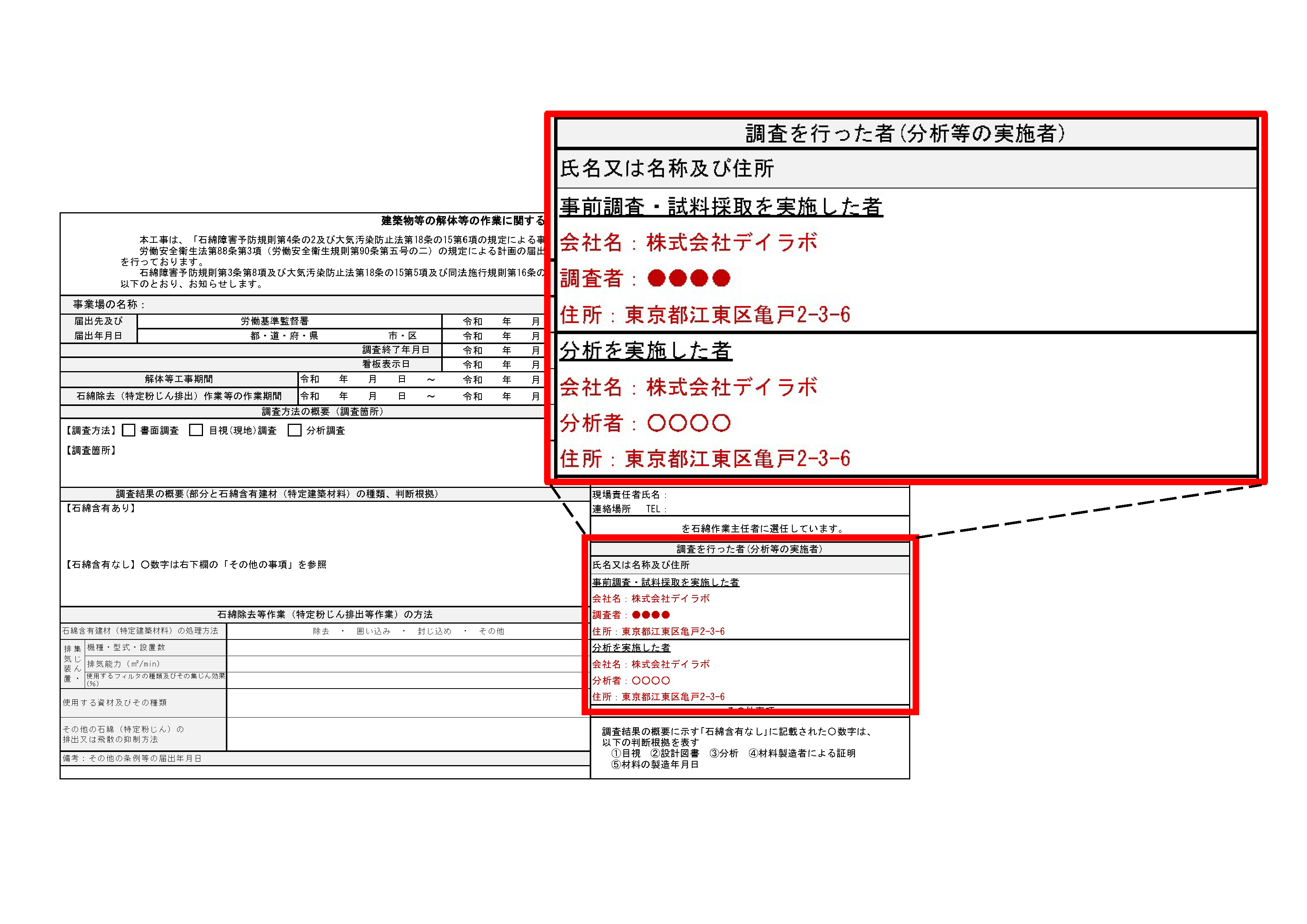 調査者・分析者の情報は、上記のような工事の際に作業内容を掲示する工事看板等においての⦅調査者を行った者(分析等の実施者)⦆の項目へも記載が必要です。こちらも併せて忘れずに行いましょう。