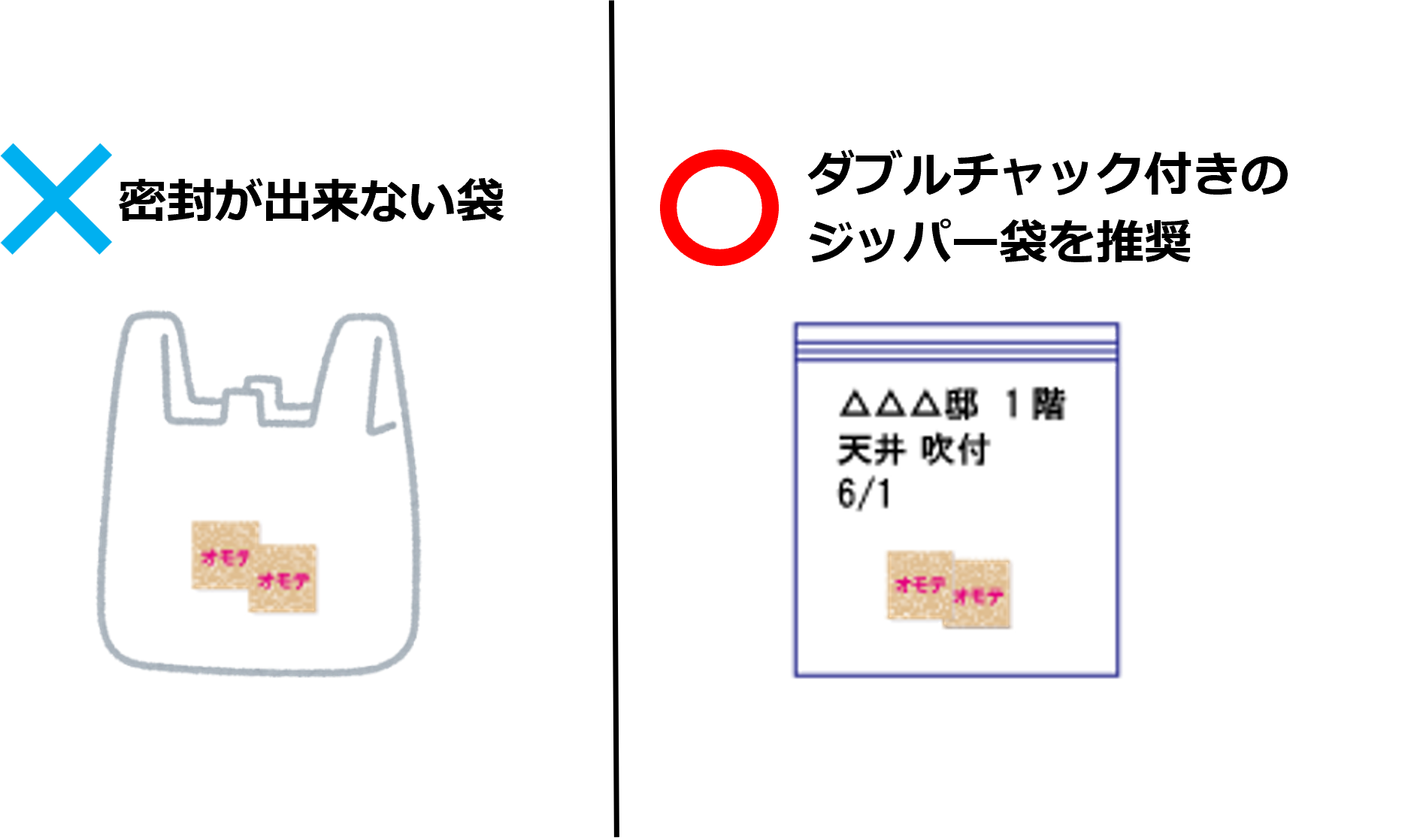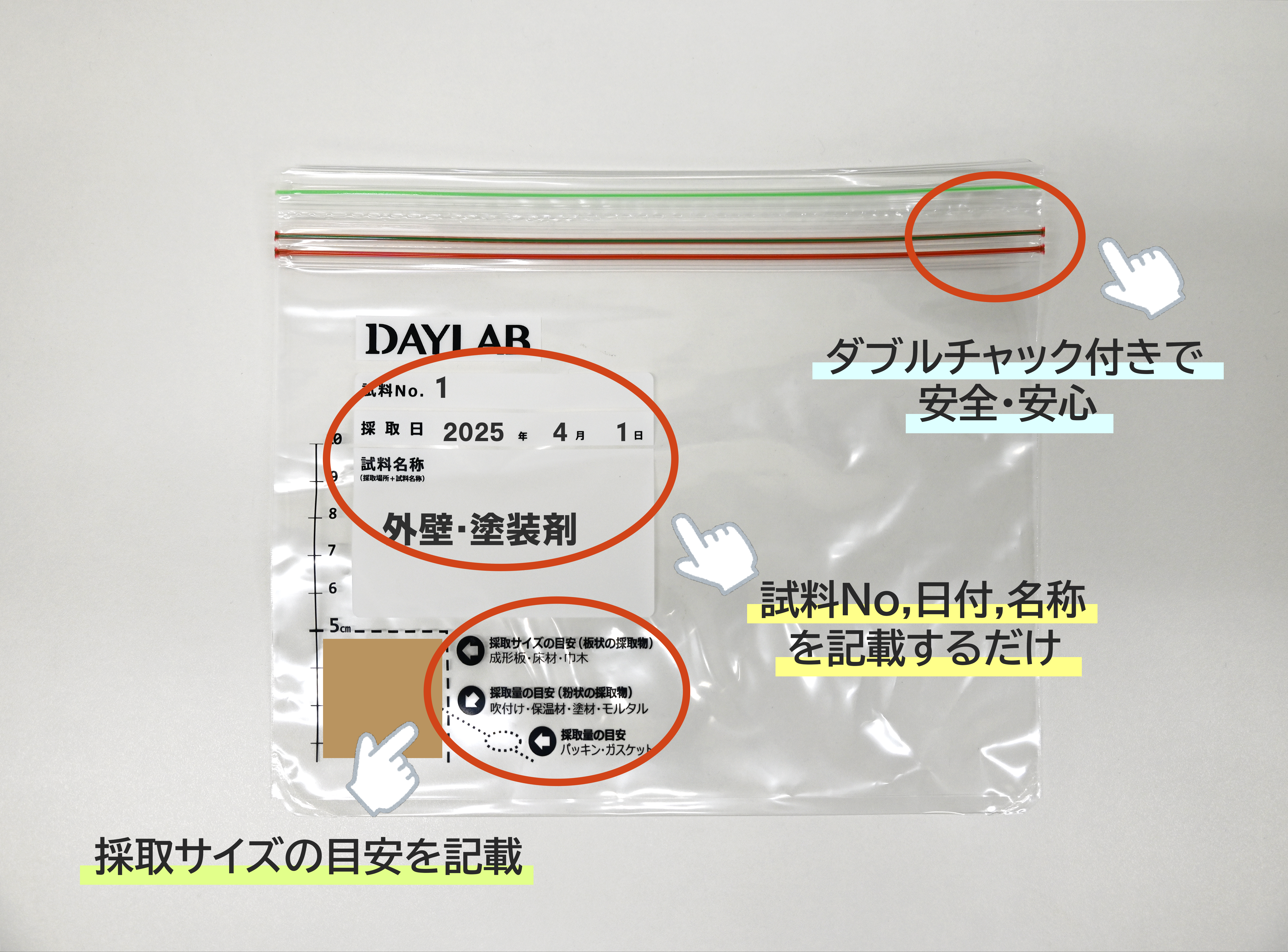 万が一の破損や内容物の漏洩を防ぐため“ダブルチャック付き(ジッパーが2本)のジッパー袋”もしくは“二重梱包”(最初の密封済み採取袋を、さらに別の丈夫なポリ袋に入れ密封)を推奨しています。
