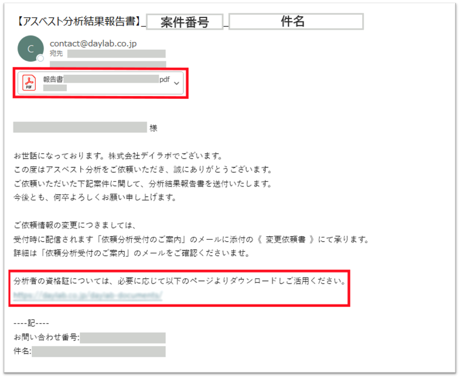 - 分析完了時にはPDF形式で分析結果報告書をメールで送付、併せて分析者の資格証を確認・ダウンロードできるリンクも案内している。