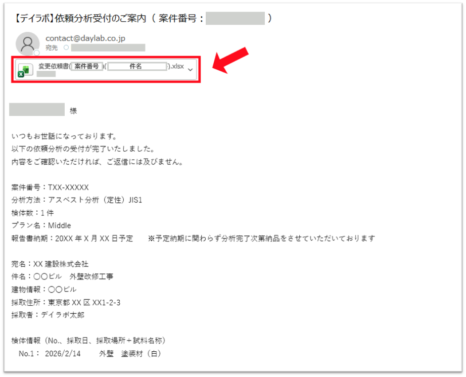 こちらの受付内容に誤りがないかをご確認いただき、このメールをもって分析開始の正式なご案内とさせていただいております。