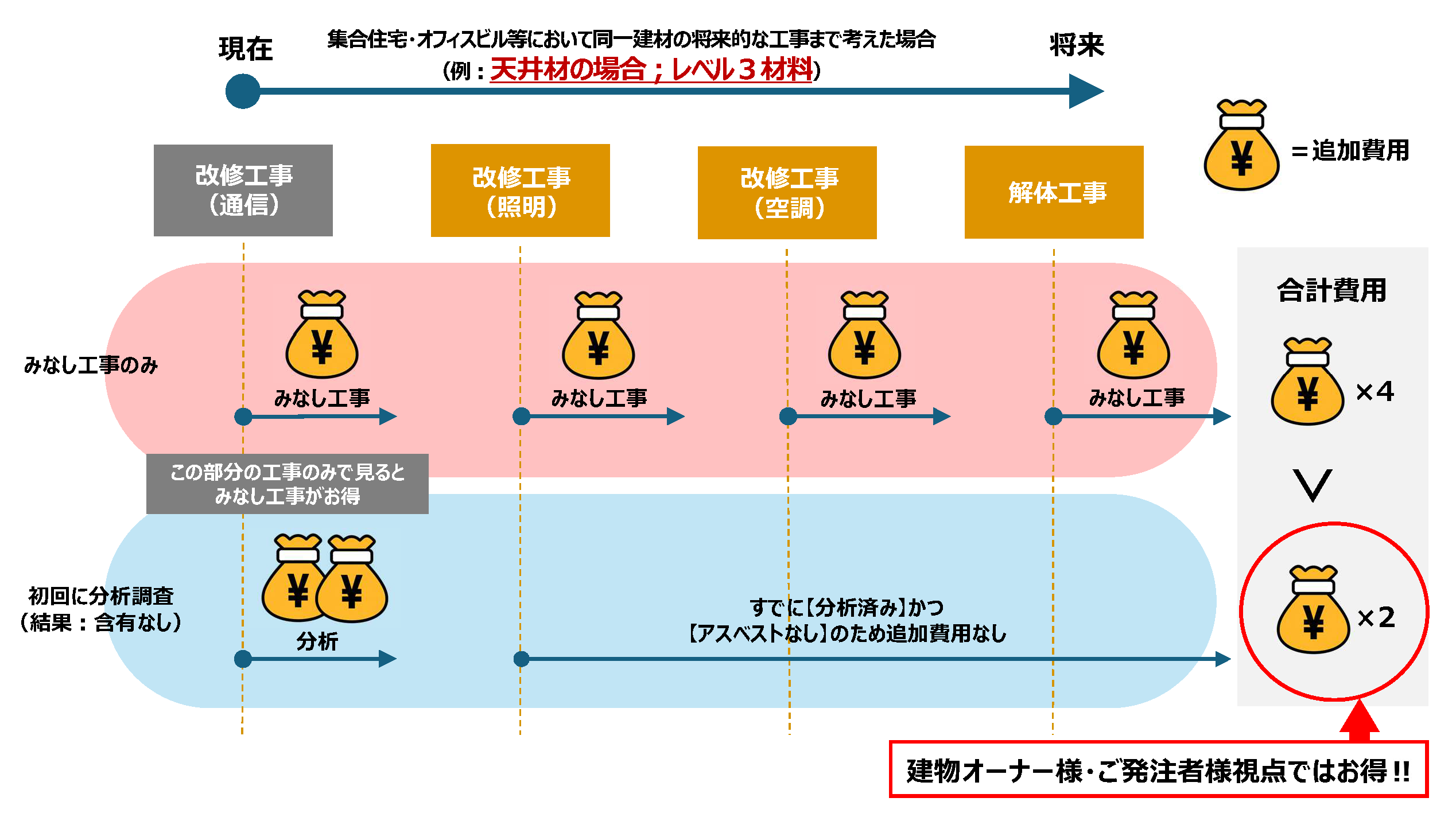 下記の図表では、集合住宅やオフィスビル等において同一建材の将来的な工事まで考えた場合の合計費用に関して、「みなし判定」で工事を進めた場合と分析調査を行った場合それぞれを表しています。